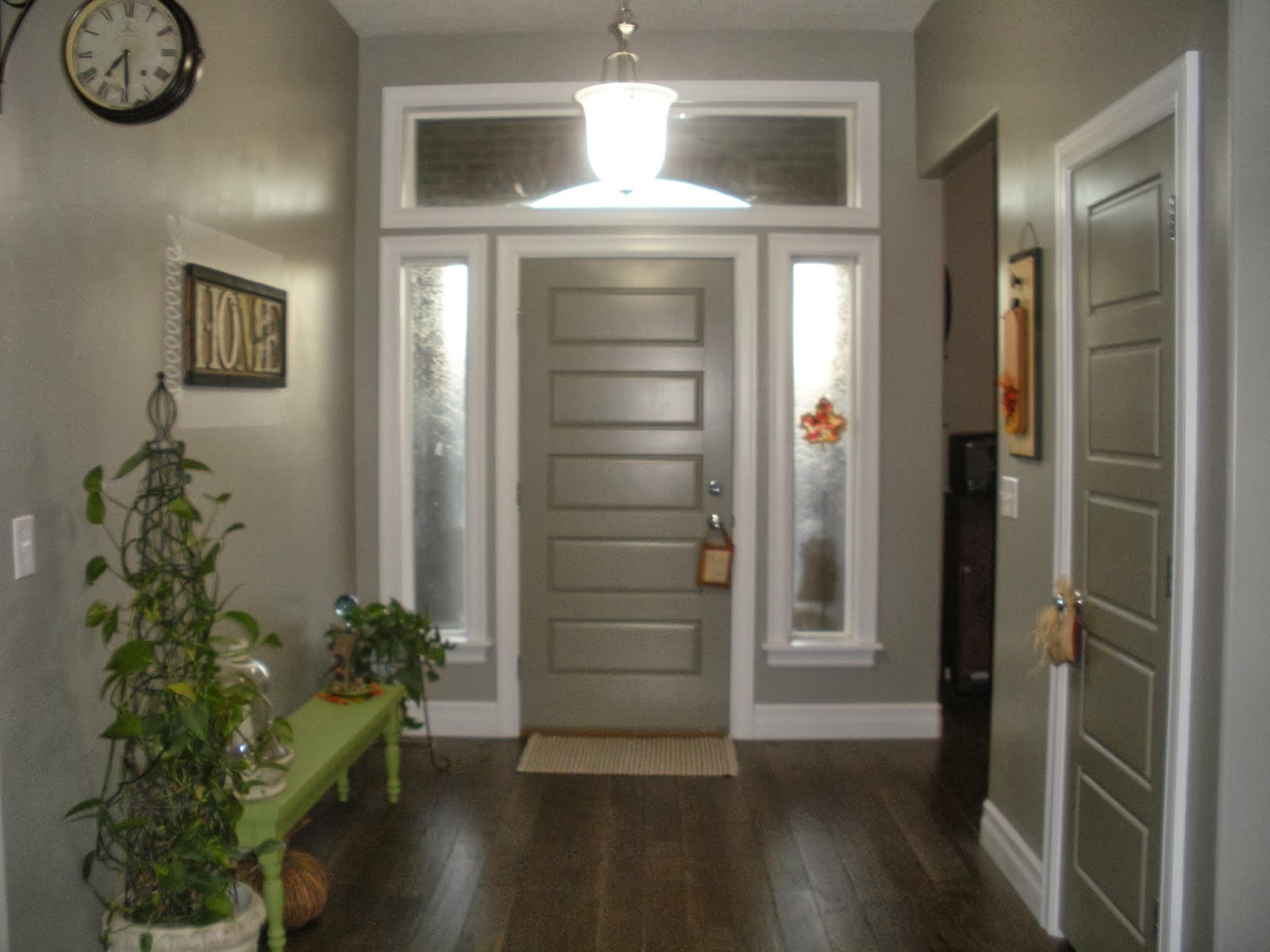 So we've recently repainted! Everything used to be off white but, as you can tell, the light greenish gray thing going on really matches the stucco exterior of the home so much better! Please also note the adorable "HOME" decoration that let's everybody know that this is friendly place where all can feel comfortable and loved! And on the opposite side of the entry way we have the true head of the household, our Lord and Savior Jesus Christ!